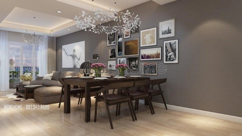 Bộ bàn ăn 6 người hiện đại tông màu nâu trầm ấm, được thiết kế ấn tượng với chi tiết đèn trang trí nghệ thuật