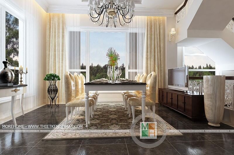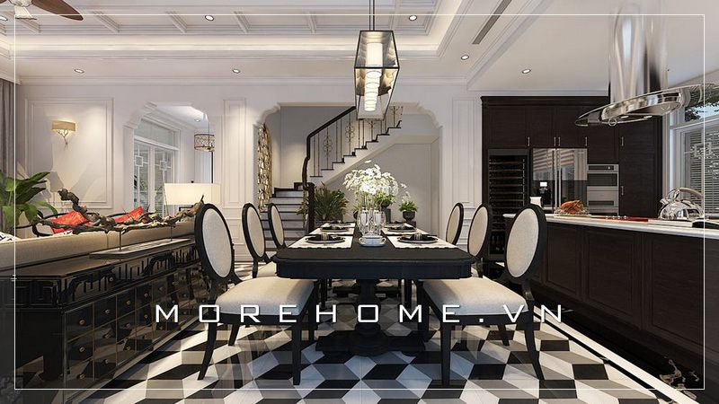 Mẫu bàn ăn gỗ với thiết kế tân cổ điển tone màu đen trắng tạo điểm nhấn cho phòng ăn biệt thự