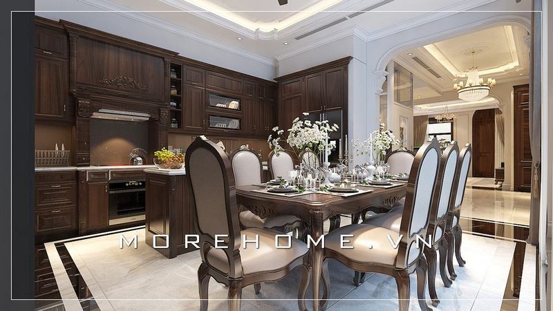 Mẫu bàn ăn tân cổ điển tone màu trầm của gỗ tự nhiên kết hợp họa tiết tân cổ điển sang trong cho phòng ăn đẳng cấp