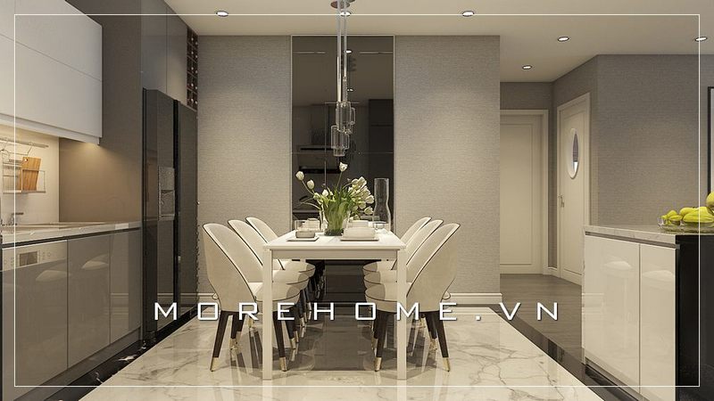 Mẫu bàn ăn chung cư đẹp với tone màu trắng bọc nỉ hiện đại, trẻ trung cho phòng ăn