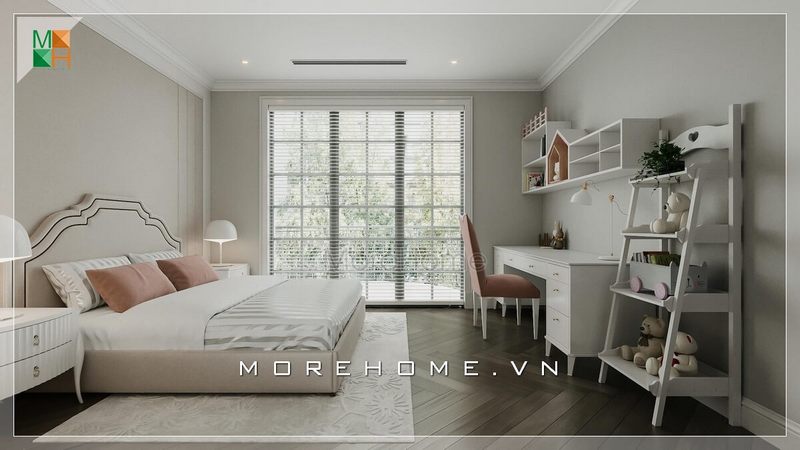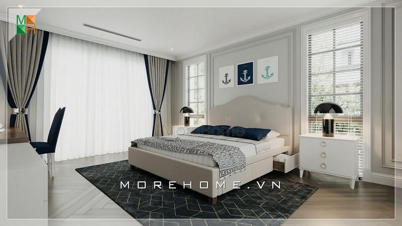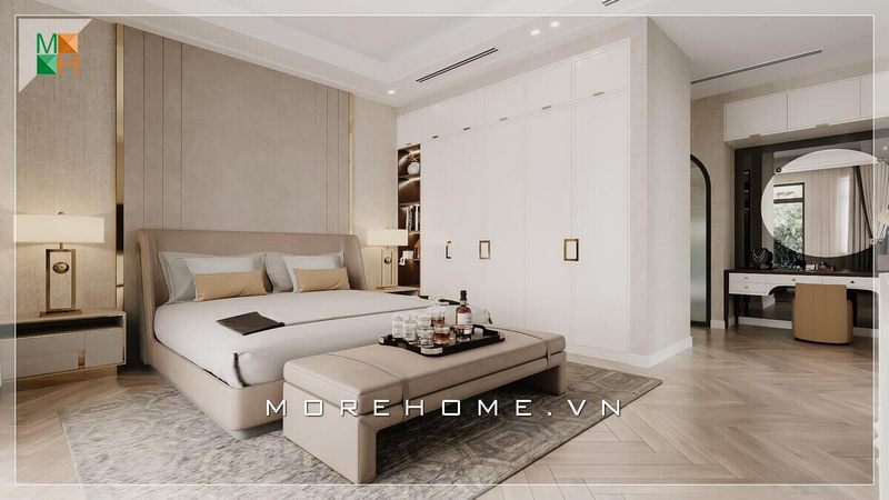 Nội thất phòng ngủ mang phong cách tân cổ điển pha chút hiện đại là sự kết hợp ăn ý giữa việc lựa chọn nội thất của chiếc giường khung gỗ hiện đại và tinh tế khi được đặt gần ngay cửa kính trượt ban công đẹp, rộng rãi hiện đại để đón ánh nắng tự nhiên của thiên nhiên.