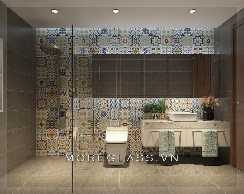Mẫu thiết kế phòng tắm đẹp với thiết bị vệ sinh đơn giản, tinh tế nổi bật với bức tường gạch men họa tiết độc áo.