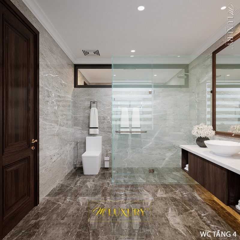 Mẫu thiết kế nhà vệ sinh hiện đại với phòng tắm kính cao cấp, thiết bị vệ sinh đơn giản, tiện nghi