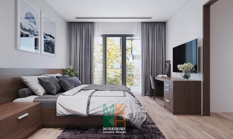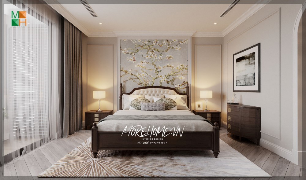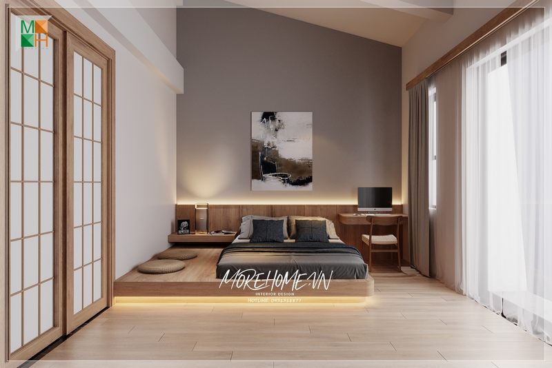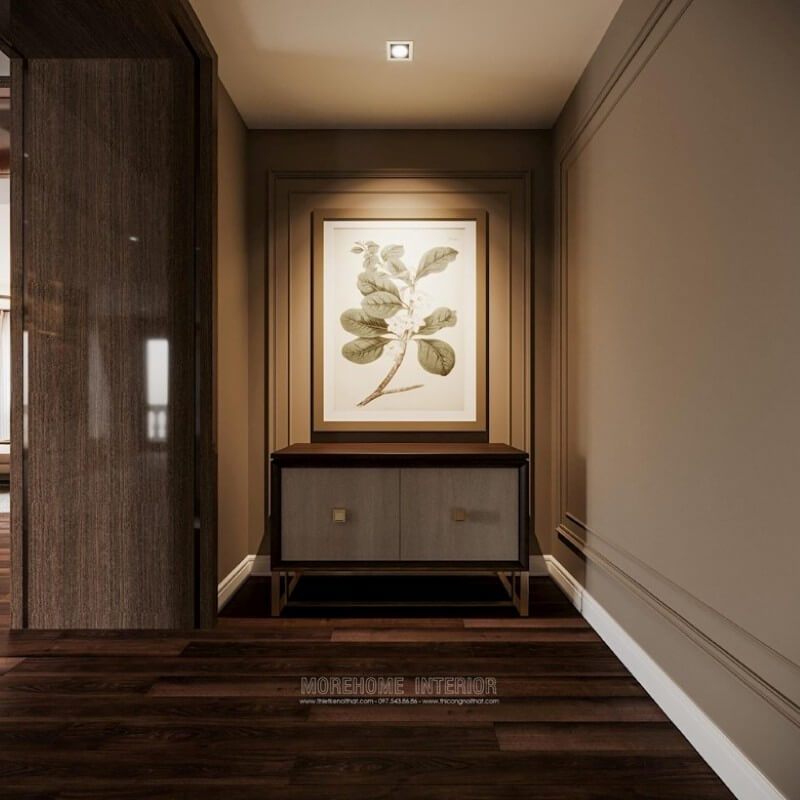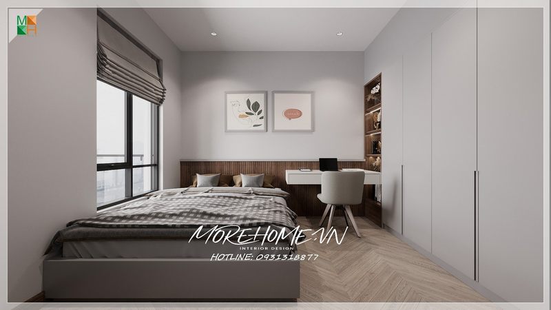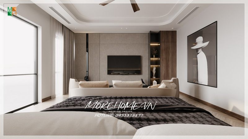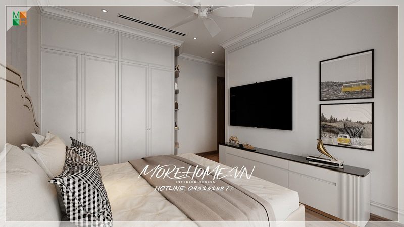 Để không bỏ lỡ góc trống nào các kiến trúc sư Morehome đã lựa chọn tranh canvas để trang trí thêm cho căn phòng đỡ trống trải tranh có họa tiết đơn giản nhưng giá trị thẩm mỹ cao