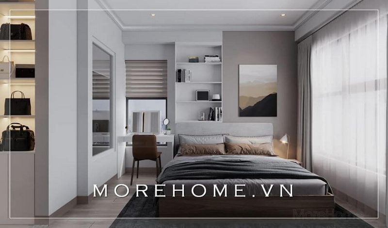 Bàn làm việc kết hợp kệ trang trí ấn tượng cho phòng ngủ