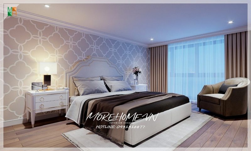 Thiết kế phòng ngủ chung cư mang phòng cách tân cổ điển, màu sắc hài hòa giữa trắng và xám khiến căn phòng trở nên sang trọng và tôn vẻ sang trọng hơn.