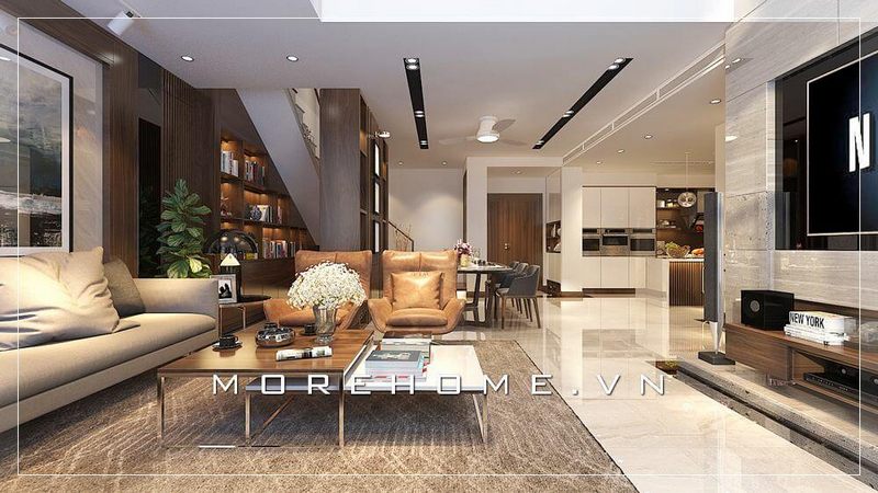 Thiết kế nội thất phòng khách chung cư phong cách hiện đại, sử dụng tone màu trầm tạo cảm giác ấm cúng và thư giản cho mọi thành viên trong gia đình