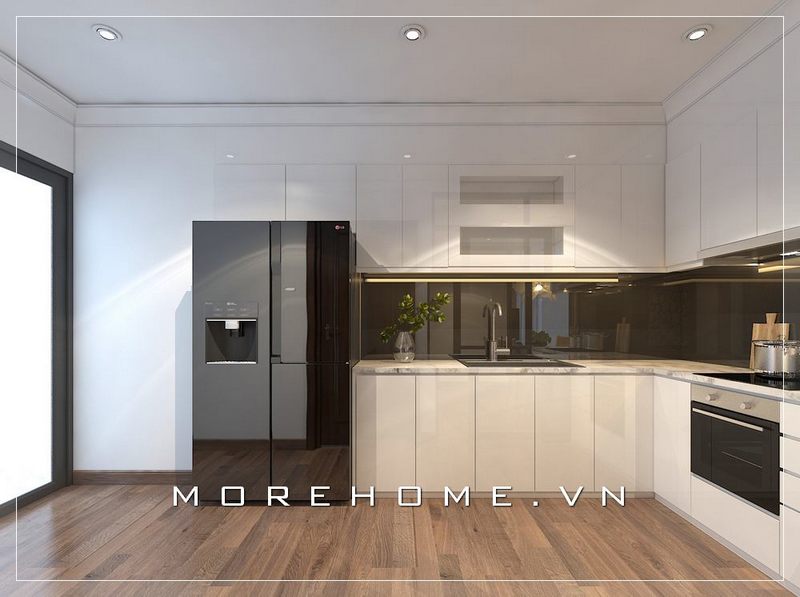 Thiết kế nội thất phòng bếp hiện đại sử dụng tone màu trắng chủ đạo tạo nên không gian tinh tế và tiện nghi