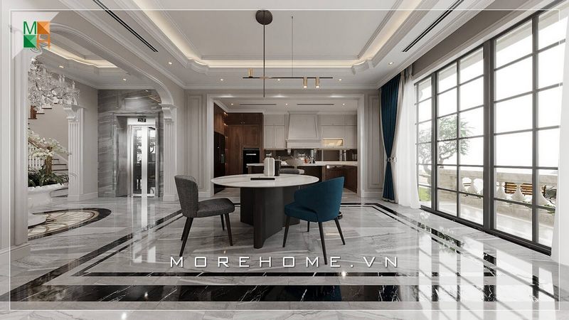 Cửa kính lớn được bố trí nơi phòng ăn rộng của biệt thự, nhà phố càng làm không gian thêm thoáng đãng tràn ngập ánh sáng tự nhiên.