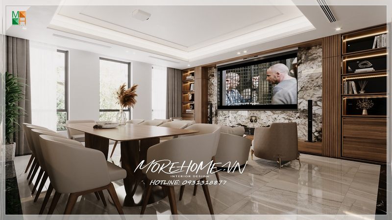 Nhờ vào sự sang trọng hiện đại của các khung cửa kính tạo ra một phòng ăn đầy ắp ánh sáng tự nhiên tạo sự thông thoáng cho không gian nơi đây.