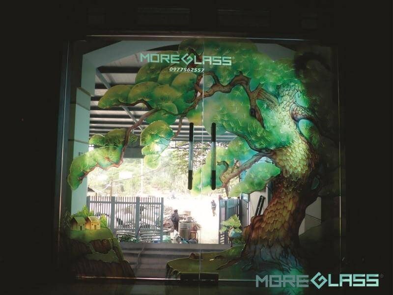 Mẫu cửa kính cường lực điêu khắc nghệ thuật cây cối thay thế cho những cánh cửa gỗ thông thường, tạo sự thoáng đãng, sáng sủa cho không gian sống của bạn