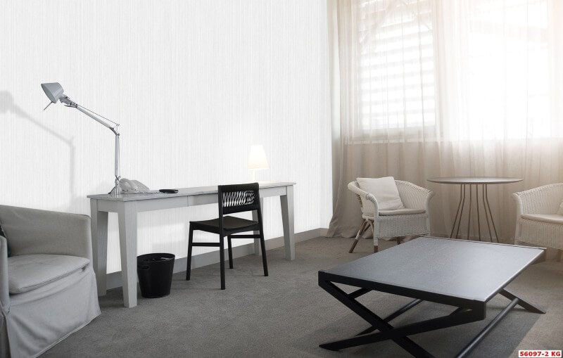 Giấy dán tường soho hiện đại màu trắng có vân kẻ dọc nhẹ nhàng mã 56097-2, mang đến cho bạn không gian sống và làm việc rộng hơn.