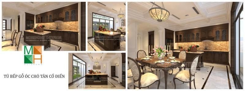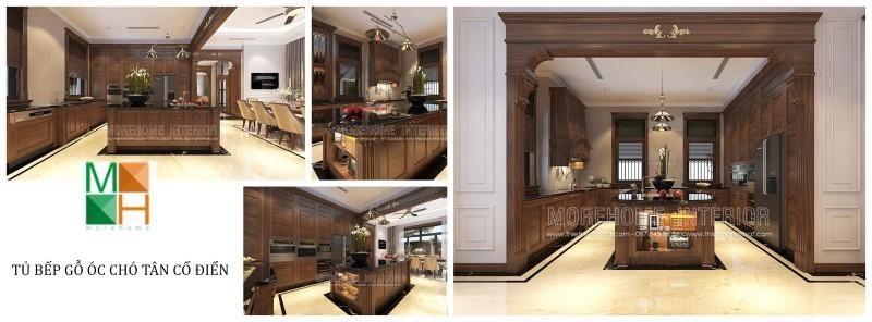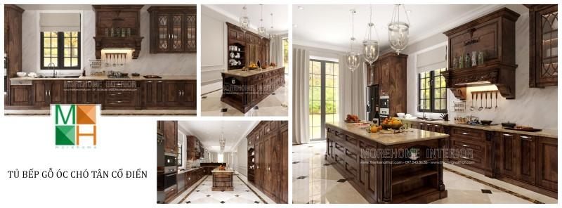 Mẫu tủ bếp gỗ óc chó tân cổ điển cao cấp được nội thất MoreHome thiết kế và thi công trọn gói.