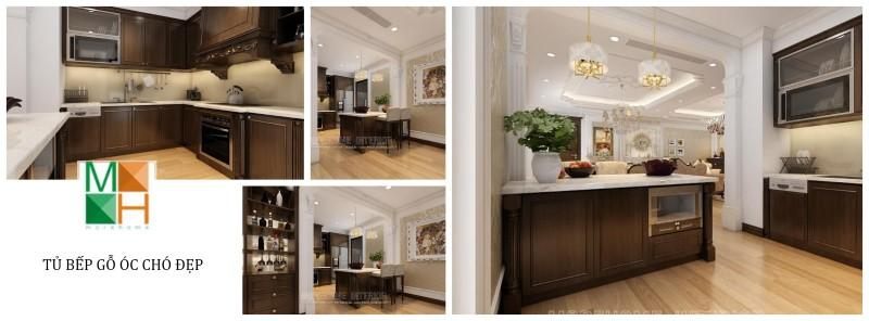 Hình ảnh thiết kế tủ bếp biệt thự bằng gỗ óc chó phong cách tân cổ điển sang trọng tinh tế ở Vinhomes Greenbay Hà Nội