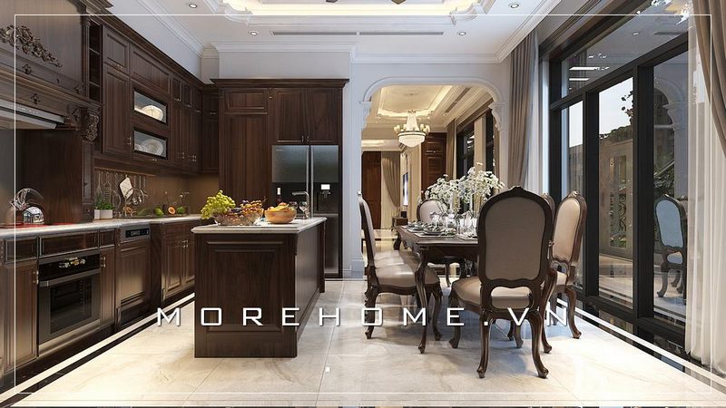 Thiết kế tủ bếp gỗ óc chó tân điển kết hợp quầy bar là sản phẩm điển hình của Nội thất Morehome trong lĩnh vực thiết kế không gian bếp.