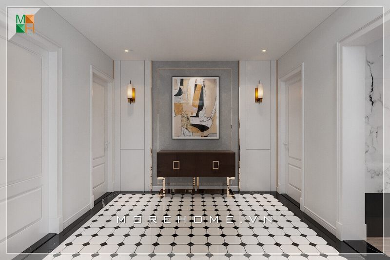 Mảng tường được kiến trúc sư lựa chọn các mẫu tranh canvas nhỏ nhằm tránh được sự trống trải trong căn phòng