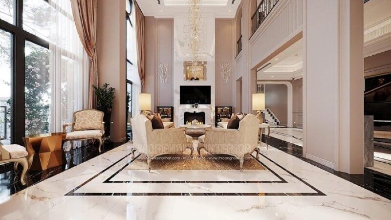 Ý tưởng sử dụng phong cách tân cổ điển đẹp cho phòng khách căn hộ chung cư thông tầng.