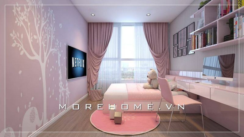 Góc học tập thiết kế liền kề phòng ngủ kết hợp với kệ sách gỗ công nghiệp đa năng và tiện nghi giúp không gian học tập của con