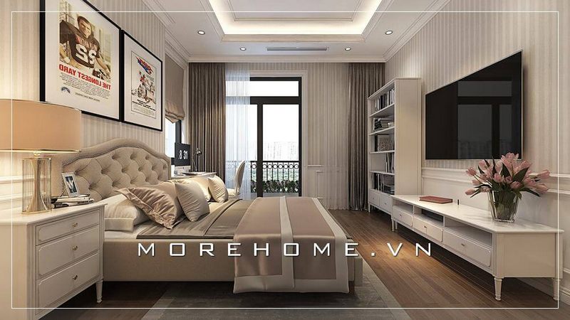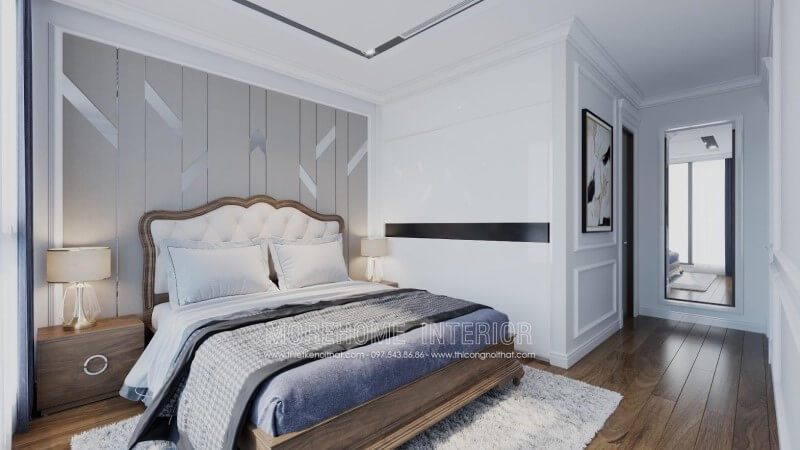 Giường ngủ mang đậm chất tân cổ điển thiết kế đầu giường uốn lượn mềm mại là điểm nổi bật nhất trong căn phòng ngủ chung cư đẹp. Nội thất trong phòng ngủ, từ kệ giá sách, bàn làm việc, tranh canvas treo đầu giường đến các chi tiết nhỏ như đèn ngủ hay đèn treo trần đều được sắp xếp hợp lý và ngăn nắp.