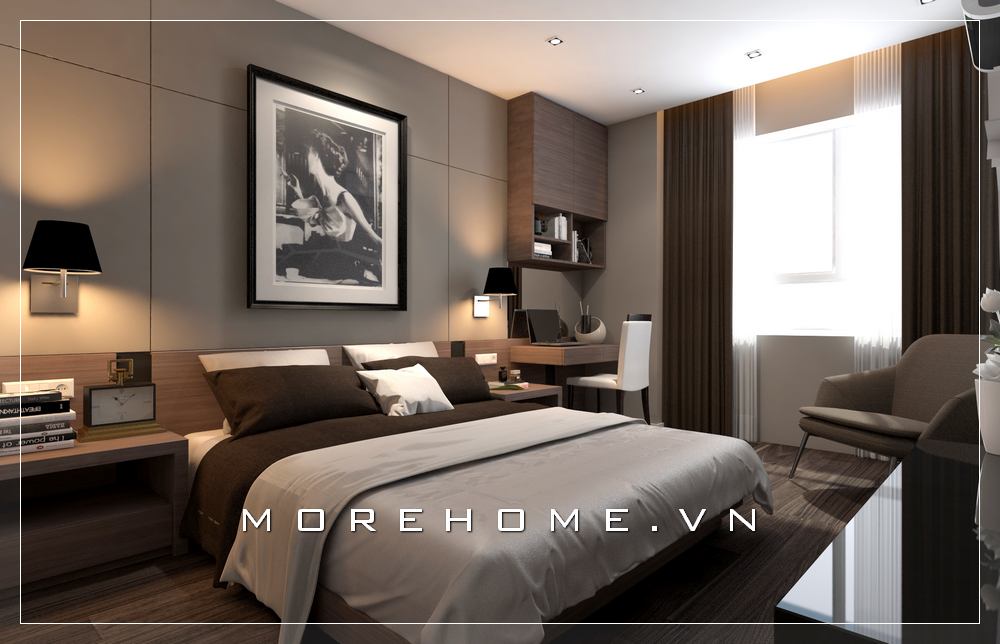 Giường ngủ hiện đại được thiết kế đơn giản, nhẹ nhàng, gam màu nâu trầm nhẹ nhàng tạo nên cảm giác thoải mái cho mỗi giấc ngủ